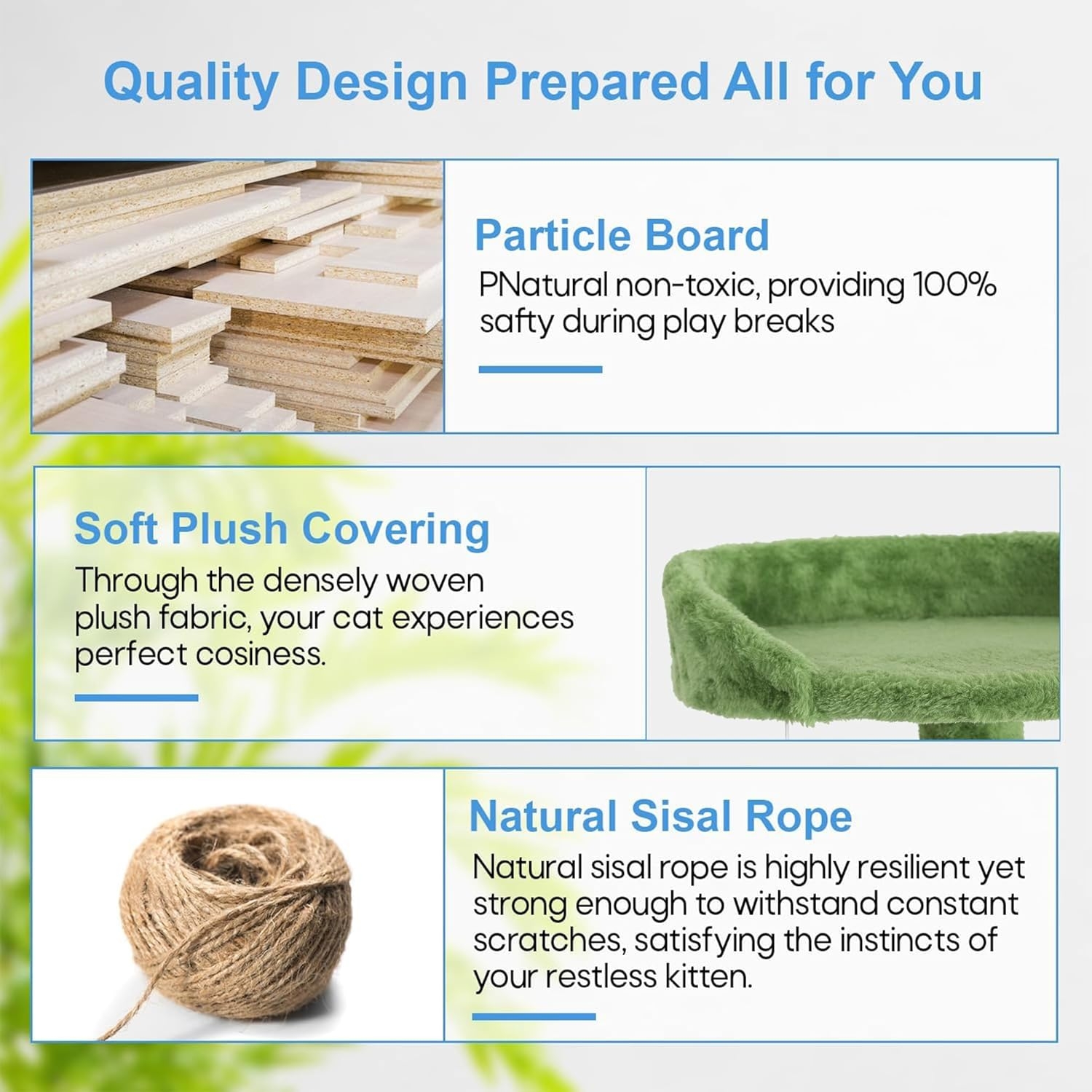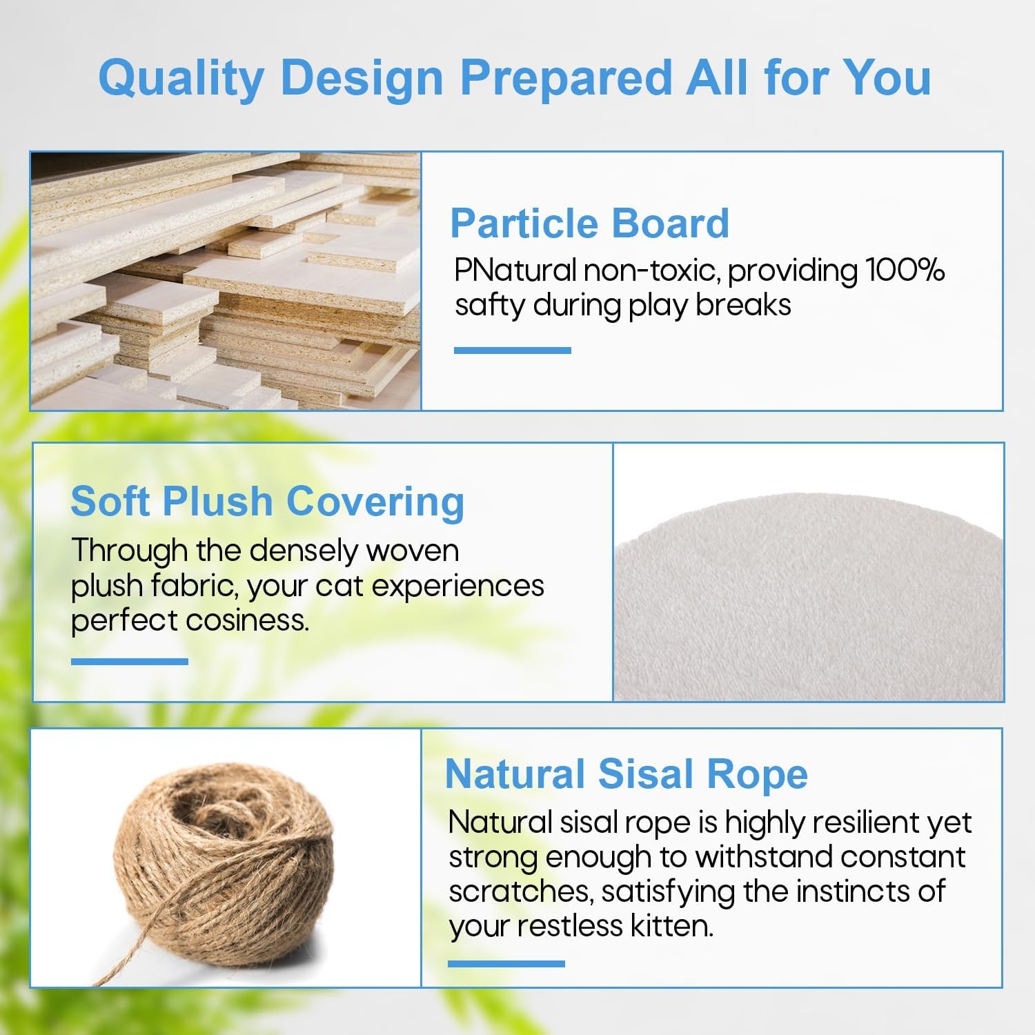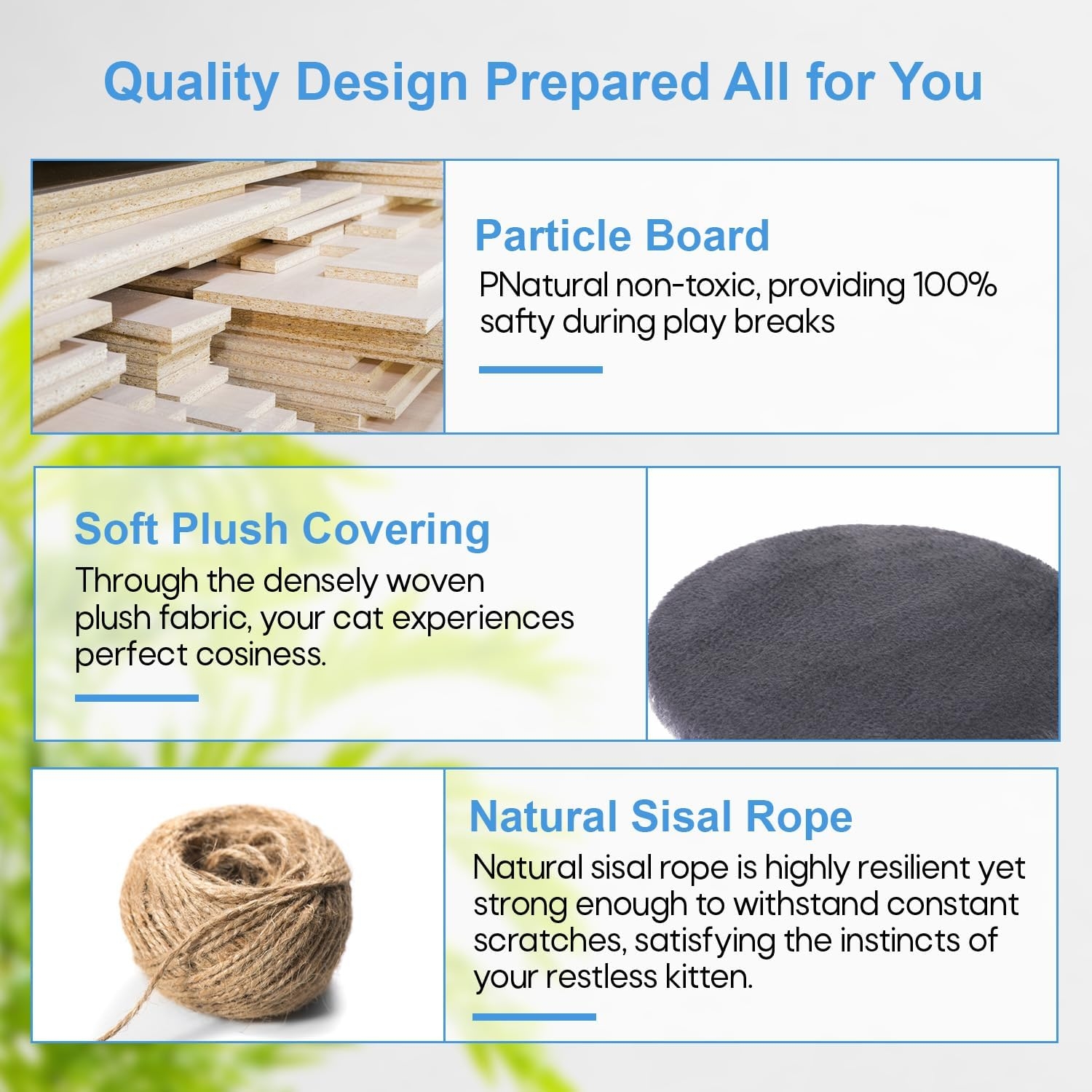Its high-density design and exceptional longevity both your cat’s safety when bouncing around on the cat tree and the stability of the structure as a whole.
