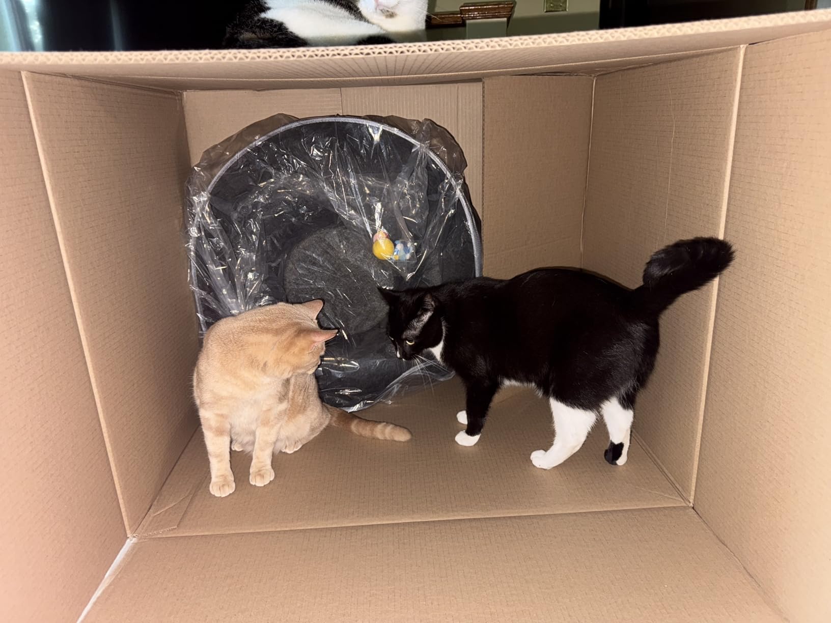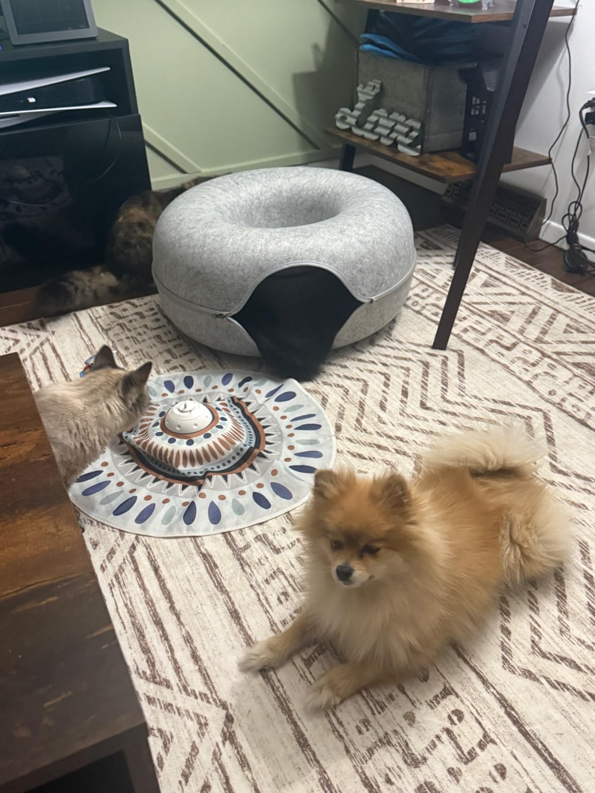 They have encouraged cat to explore the tunnel by us throwing the soft balls around inside for it to be seen when it comes around, and dog ,too big for tunnel, is just a fascinated by the sound and movement so it’s a good toy for every family member as it brings a moment of joy for us as well seeing the pets happy and safely curious.