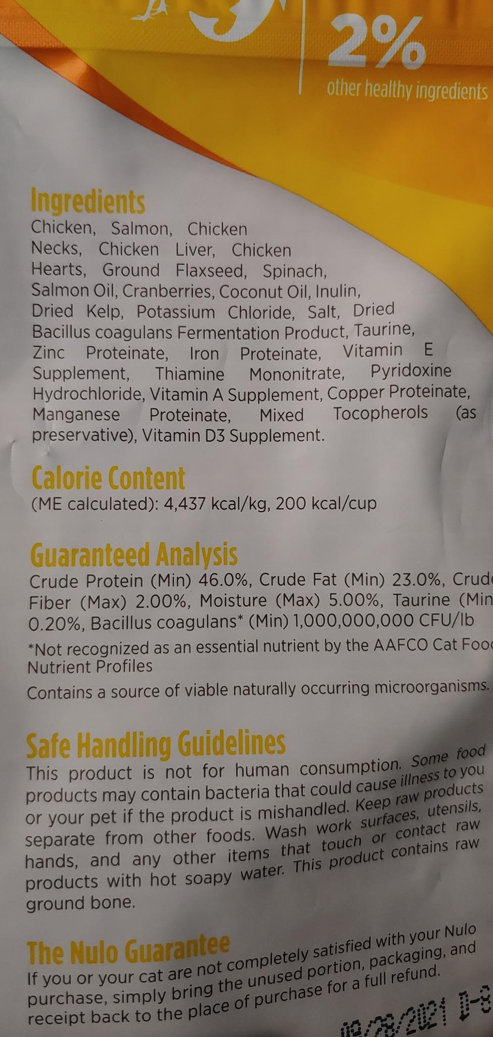 For those needing to know how long a bag will last: a dry cup of this very lightweight crumbly nulo food weights 1.40 ounce or 40 grams which equals 200 calories per cup.. take your cat’s weight and times it by 15 if inactive or 20 if active (assuming not underweight, kitten age and you have a regular cat) and this will give you the calories your cat needs (divide that by 5 to get grams to feed per day).. basically for a 10lb ‘active’ cat, an 8oz bag will last 5.5 days..