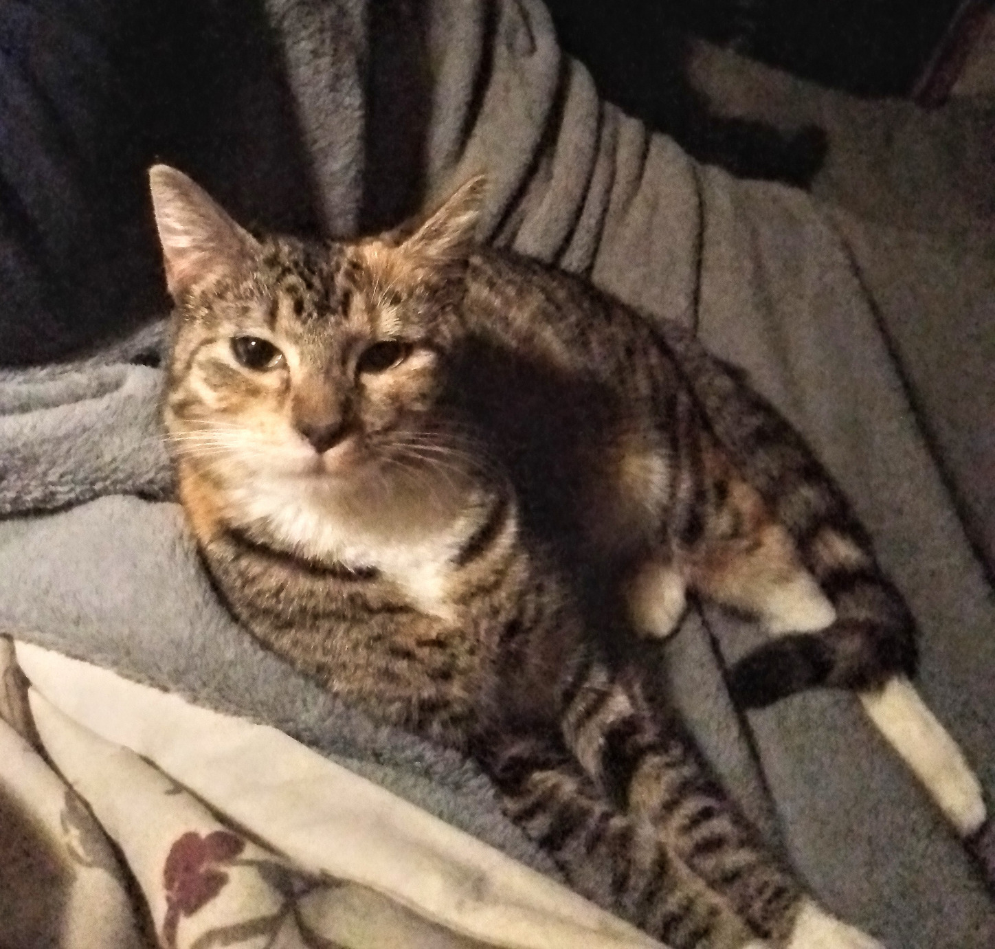 Derpy - Age 10 - American Shorthair Tabby - Largest and most sensitive cat. Loves to eat TOO much, will eat other cats food if I don’t keep an eye on her. She developed a grain and corn allergy at age 6, finding safe foods for her can be challenging. She likes her food to be fully hydrated with water, but won’t eat it if there is too much water on the top. She is no fool and doesn’t wish to ‘fill up on water.” She had zero difficulties with the inclusion of raw food into her daily routine.