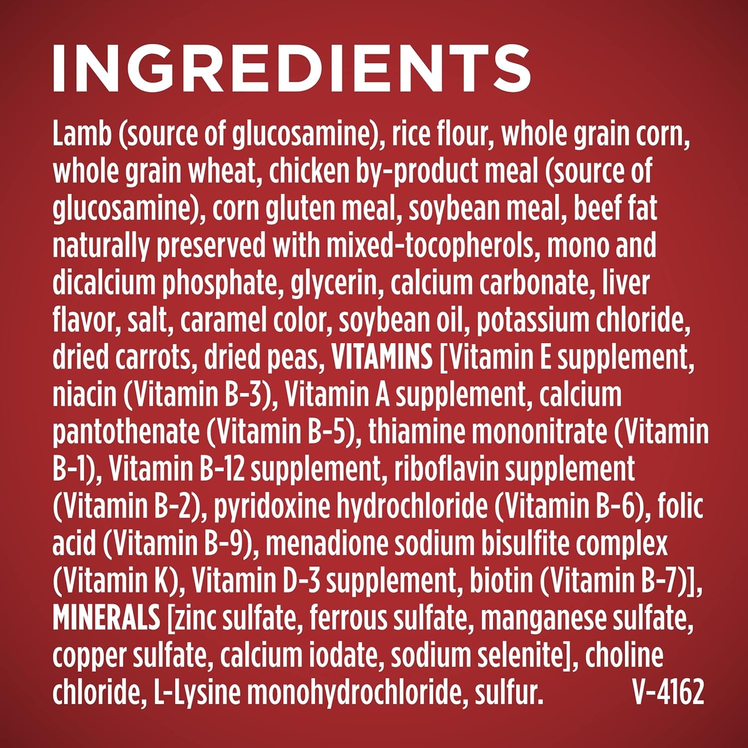 Lamb (Source of Glucosamine), Rice Flour, Whole Grain Corn, Whole Grain Wheat, Chicken By-Product Meal (Source of Glucosamine), Corn Gluten Meal, Soybean Meal, Beef Fat Naturally Preserved with Mixed-Tocopherols, Mono and Dicalcium Phosphate, Glycerin, Calcium Carbonate, Liver Flavor, Salt, Caramel Color, Soybean Oil, Potassium Chloride, Dried Carrots, Dried Peas, Vitamins [Vitamin E Supplement, Niacin (Vitamin B-3), Vitamin A Supplement, Calcium Pantothenate (Vitamin B-5), Thiamine Mononitrate (Vitamin B-1), Vitamin B-12 Supplement, Riboflavin Supplement (Vitamin B-2), Pyridoxine Hydrochloride (Vitamin B-6), Folic Acid (Vitamin B-9), Menadione Sodium Bisulfite Complex (Vitamin K), Vitamin D-3 Supplement, Biotin (Vitamin B-7)], Minerals [Zinc Sulfate, Ferrous Sulfate, Manganese Sulfate, Copper Sulfate, Calcium Iodate, Sodium Selenite], Choline Chloride, L-Lysine Monohydrochloride, Sulfur. V-4162.